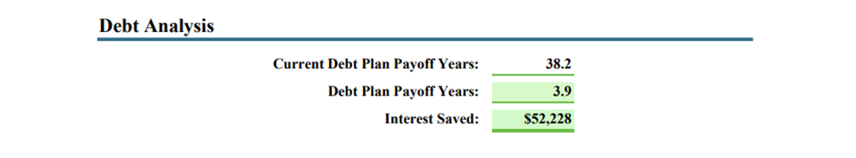 With our plan, using a product available for the last 100+ years from a company who has been selling it for 100+ years, Ryan will be debt free in 3.9 years!  And, instead of paying $110K in interest, the new plan will save him more than $61K in in interest!  Quite a start for a solid retirement!